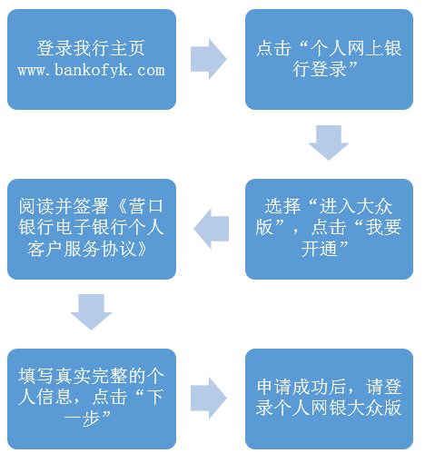 持有營(yíng)口銀行卡或存折的客戶,可以通過(guò)任意一臺(tái)連接Internet的電腦登錄m.cqyxyq.com自助注冊(cè)營(yíng)口銀行個(gè)人網(wǎng)上銀行大眾版,具體操作流程如下: ![]() |