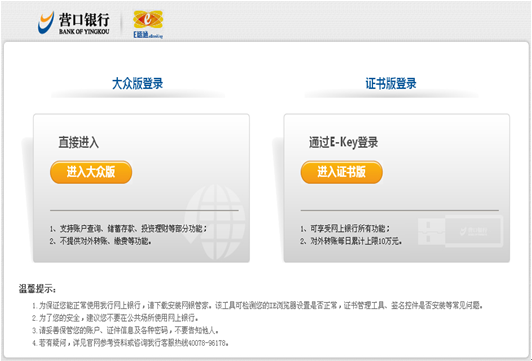 營口銀行個(gè)人網(wǎng)上銀行專業(yè)版提供賬戶管理、轉(zhuǎn)賬匯款、自助繳費(fèi)、儲(chǔ)蓄理財(cái)、投資理財(cái)、自助簽約、客戶服務(wù)等功能。您可以選擇相應(yīng)的菜單后點(diǎn)擊需要操作的子菜單進(jìn)行操作。 |