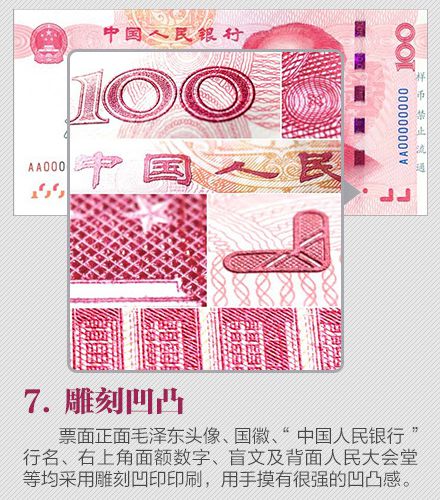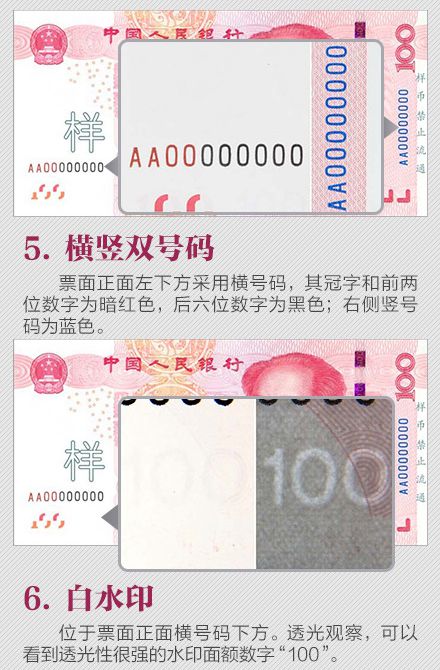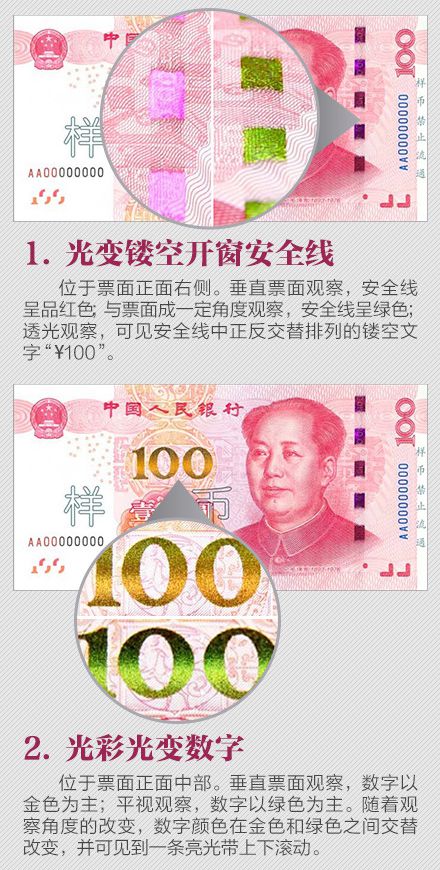 為更好地保護(hù)人民幣持有人的利益,需要根據(jù)科學(xué)技術(shù)的發(fā)展,不斷提高鈔票的防偽技術(shù)和印制質(zhì)量,保持人民幣防偽技術(shù)的領(lǐng)先地位。為此,中國(guó)人民銀行發(fā)行了2015年版第五套人民幣100元紙幣,在保持規(guī)格、主圖案、主色調(diào)等與2005年版第五套人民幣100元紙幣不變的前提下,對(duì)票面圖案、防偽特征及其布局進(jìn)行了調(diào)整,提高機(jī)讀性能,采用了先進(jìn)的公眾防偽技術(shù),更易于識(shí)別真?zhèn)巍?015年版第五套人民幣100元紙幣發(fā)行后,與同面額流通人民幣等值流通。 那么,新版人民幣的防偽特征有哪些?如何識(shí)別假鈔?殘缺、污損的人民幣要如何兌換?本文將帶你了解關(guān)于人民幣識(shí)別、兌換等最實(shí)用的知識(shí)。 ![]() ![]() ![]() ![]() ![]() ![]() ![]() ![]() ![]() ![]() 掃一掃 識(shí)別二維碼 可參與反假幣答題 還有機(jī)會(huì)贏好禮